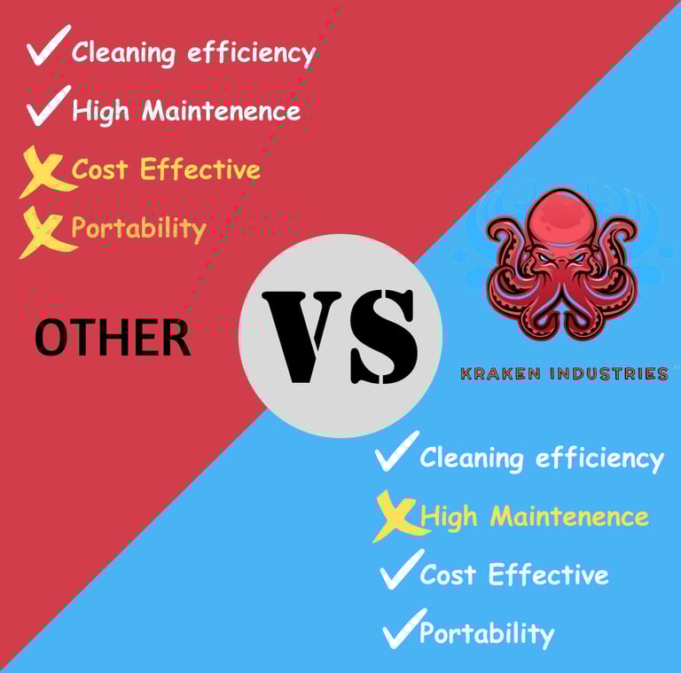 Unlike our competitors, Kraken® eliminates unnecessary features and exorbitant price tags, giving you peace of mind by removing the burden of costly hydraulic repairs. If your vehicle encounters issues, effortlessly transfer the system to another truck and continue your work without missing a beat. With Kraken®, you’ll experience a refreshing shift towards practicality and resilience, where durability and efficiency take center stage. This focus ensures you not only survive but thrive in the trash bin cleaning industry, empowering you to maximize productivity and profits at every turn.
